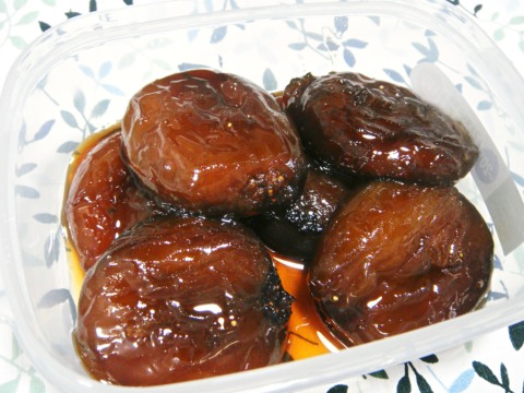 それから大量の砂糖と少量の酢でグツグツ。今回は数が少ないので水も足しておく。砂糖は3回に分けて入れることにした。2回目を入れてしばらく煮込んだところで火を消して3回目の砂糖をふりかけて一晩おく。次の朝にまだしばらく煮込んでできあがり。