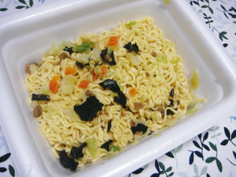かやくを麺のうえにあけて、お湯を入れ、3分。そしてお湯を捨てるところまでは同じ。
