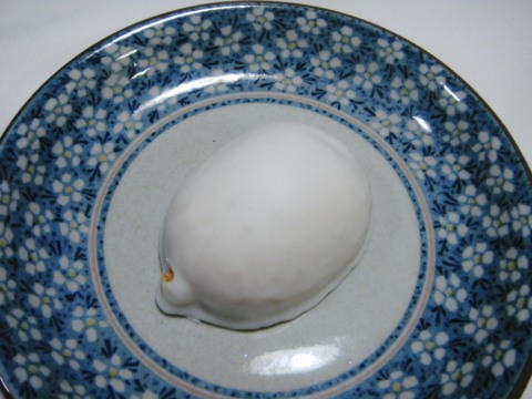 レモンピールが中に入ったスポンジケーキにチョコレートがかかったレモン型のこれ。幼い頃の思い出ではチョコレートもレモン色だった気がするのだが、もしかすると思い違いだったかも知れない。