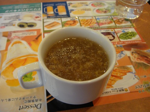 ご飯セットは271円。これにはスープバーがついている。スープバーの場所に行ってみたら、スープは3種類おいてあった。いかにも原価が安そうなスープだ。