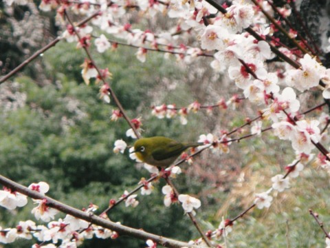 さらに歩いていると、住宅地の真ん中で梅が咲き乱れ、メジロがちょこちょこと花の蜜をついばんでいたりする。ちょこちょこ動くのでかなり写真におさめるのが大変なのだが、運良く画像におさめることができた。