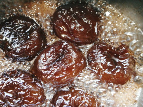 それから大量の砂糖と少量の酢でグツグツ。今回は数が少ないので水も足しておく。砂糖は3回に分けて入れることにした。2回目を入れてしばらく煮込んだところで火を消して3回目の砂糖をふりかけて一晩おく。次の朝にまだしばらく煮込んでできあがり。